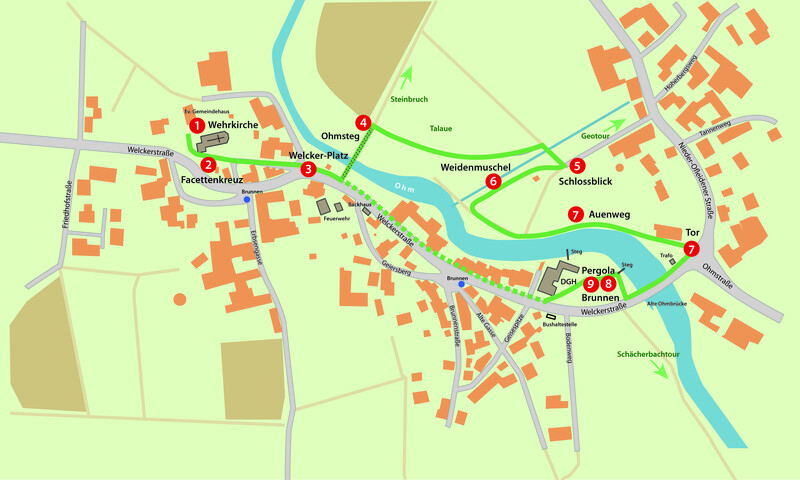Der Welcker-Wiesen-Weg führt Sie in 1,5 km von der Ohmbrücke in Ober-Ofleiden durch die idyllischen Ohmauen vorbei an Kunstwerken verschiedener Künstler über den neuen Ohmsteg zur mittelalterlichen Wehrkirche und zum Mehrgenerationenhaus in Ober-Ofleiden. Sein Garten lädt Sie zum Verweilen im Schatten der kunstvollen Pergola am plätschernden Brunnen ein, während Ihre Kinder auf dem Spielplatz toben.